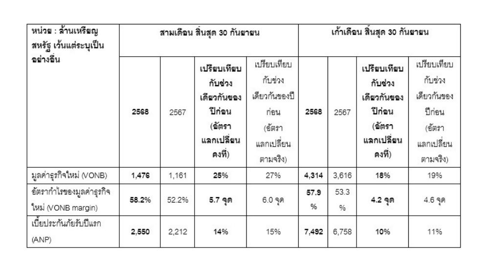 - มูลค่าธุรกิจใหม่ (VONB) เติบโตร้อยละ 25 คิดเป็น 1,476 ล้านเหรียญสหรัฐ ทำสถิติสำหรับไตรมาสที่สาม