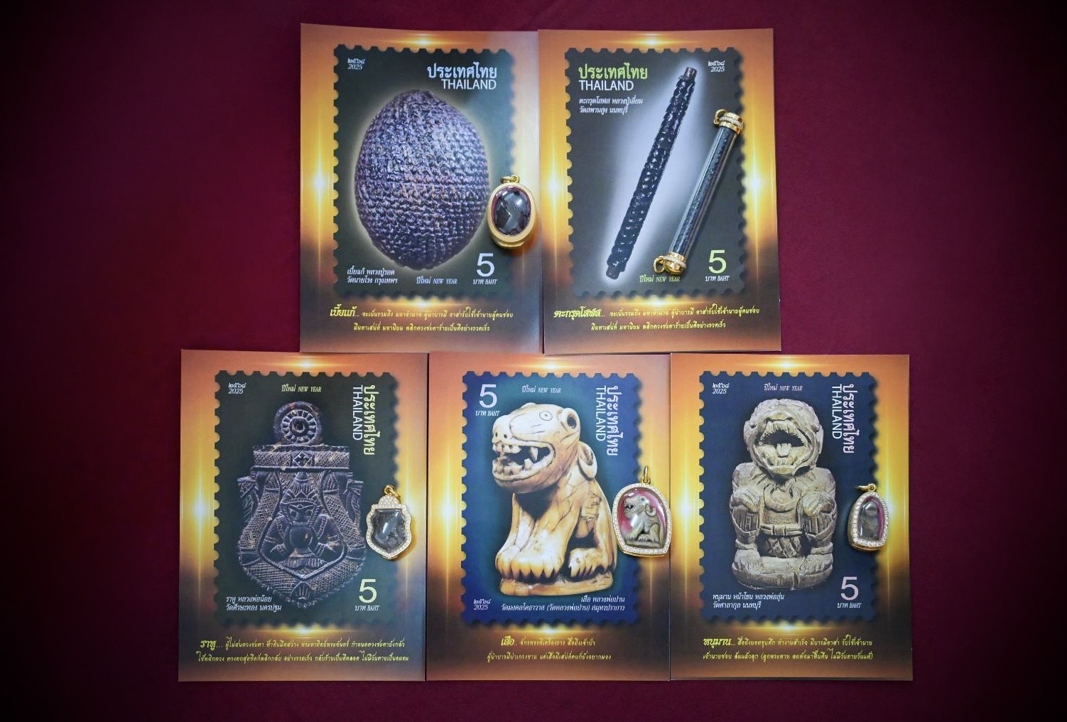 บริษัท ไปรษณีย์ไทย จำกัด เปิดตัวตราไปรษณียากรรุ่นพิเศษ ชุดปีใหม่ 2569 ภาพเบญจภาคีเครื่องราง ที่นำแรงบันดาลใจจากเครื่องรางไทยระดับตำนานทั้งห้า ได้แก่ 1. เสือ หลวงพ่อปาน 2. หนุมาน หลวงพ่อสุ่น 3. เบี้ยแก้ หลวงปู่รอด 4. ราหูกะลาแกะ หลวงพ่อน้อย 5. ตะกรุดมหาโสฬส หลวงปู่เอี่ยม มาถ่ายทอดเป็นผลงานศิลปะบนดวงแสตมป์อย่างวิจิตรงดงาม