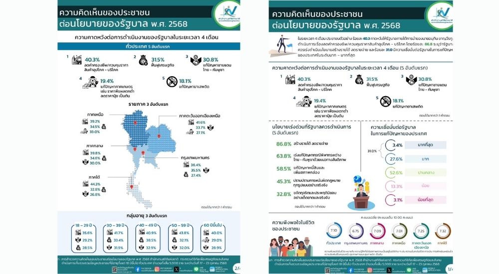 ดร.เอกพงษ์ หริ่มเจริญ ผู้อำนวยการสำนักงานสถิติแห่งชาติ เปิดเผยว่า “สำนักงานสถิติแห่งชาติ" ดำเนินการสำรวจความคิดเห็นของประชาชนต่อนโยบายของรัฐบาล พ.ศ. 2568 ระหว่างวันที่ 17 - 23 ตุลาคม 2568 สรุปผลที่น่าสนใจได้ดังนี้
