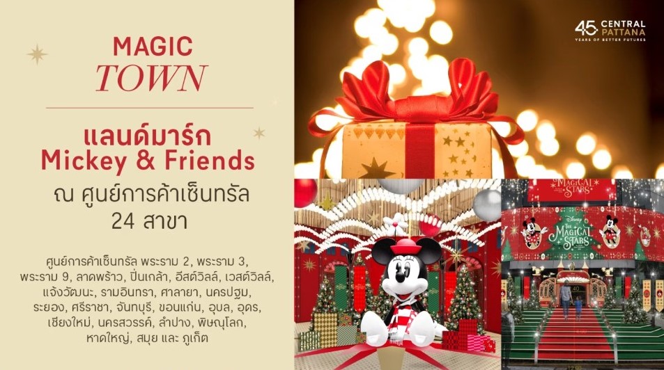 มอบความสุขให้แฟน ๆ มิคกี้ เมาส์, มินนี่ เมาส์, โดนัลด์ ดั๊ก, เดซี่, กูฟฟี่ ทั่วประเทศ ภายใต้ธีม “Magic Town” ผ่านการตกแต่ง Mickey & Friends สุดน่ารักและมีเอกลักษณ์เฉพาะในแต่ละศูนย์ฯ พาทุกคนไปถ่ายรูปกับแลนด์มาร์กสุดประทับใจ อาทิ Mickey & Minnie Giant Inflatable สุดตระการตา, Mickey & Minnie Giant Plush Dolls สูง 3 เมตร และแลนด์มาร์ก Mickey Head Shape ที่เซ็นทรัล 24 สาขา ได้แก่ พระราม 2, พระราม 3, พระราม 9, ลาดพร้าว, ปิ่นเกล้า, อีสต์วิลล์, เวสต์วิลล์, แจ้งวัฒนะ, รามอินทรา, ศาลายา, นครปฐม, ระยอง, ศรีราชา, จันทบุรี, ขอนแก่น, อุบล, อุดร, เชียงใหม่, นครสวรรค์, ลำปาง, พิษณุโลก, หาดใหญ่, สมุย และ ภูเก็ต