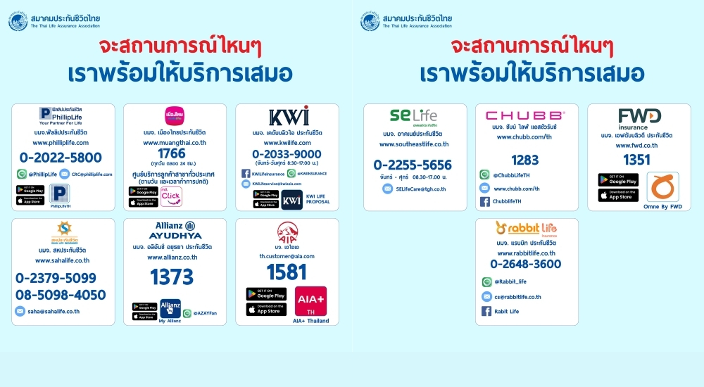 หากต้องการสอบถามข้อมูล หรือขอคำแนะนำเกี่ยวกับกรมธรรม์หรือความคุ้มครอง สามารถติดต่อสอบถามได้ที่สมาคมประกันชีวิตไทย ผ่านช่องทาง Facebook : สมาคมประกันชีวิตไทย และทางโทรศัพท์ 02-679-8080 หรืออีเมล tlaa@tlaa.org