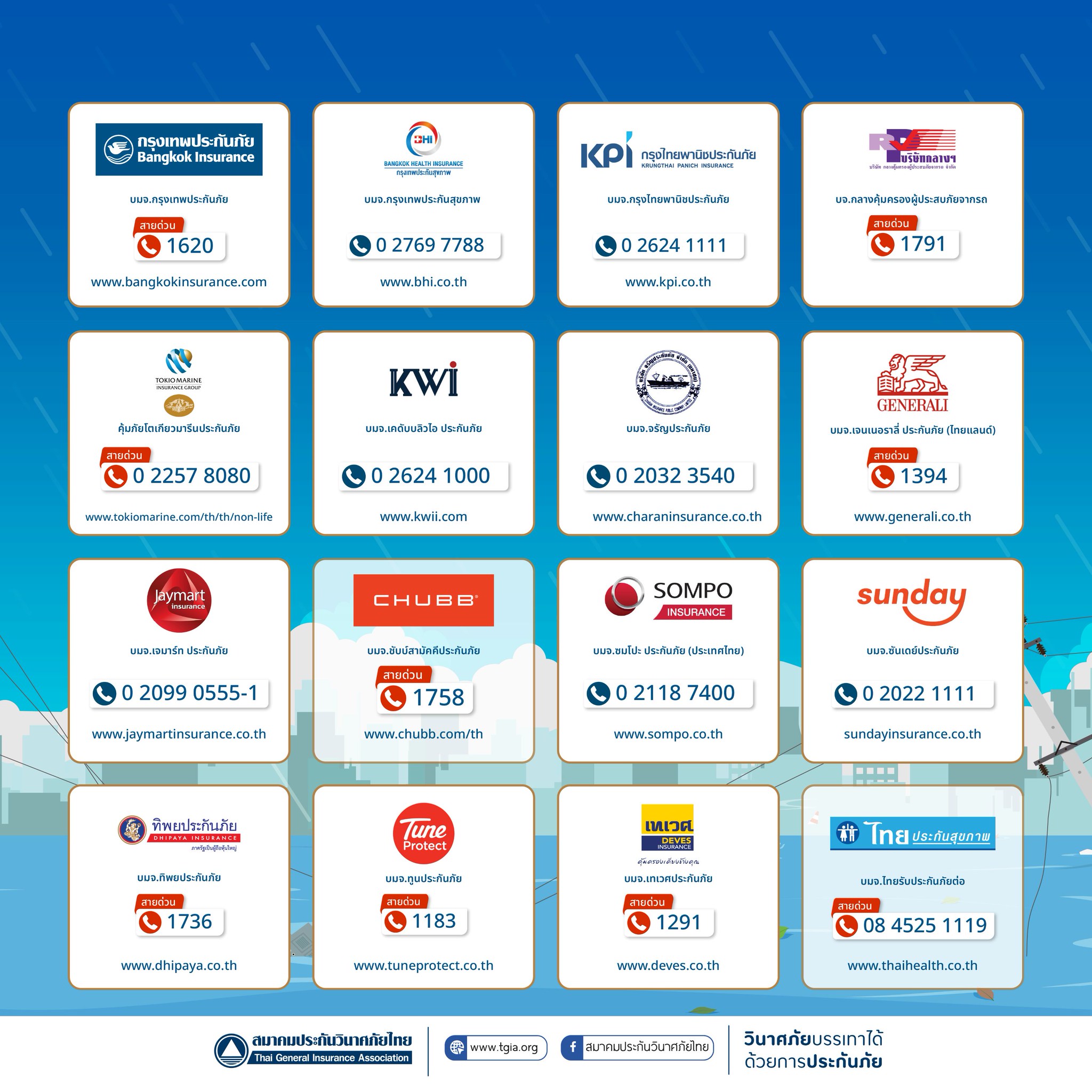 ดร. สมพร สืบถวิลกุล นายกสมาคมประกันวินาศภัยไทย กล่าวเพิ่มเติมว่า นอกจากนี้ เพื่อเป็นการดูแลและให้บริการผู้เอาประกันภัยที่ได้รับความเสียหาย สมาคมประกันวินาศภัยไทย ได้ตั้งศูนย์ประสานงานและอำนวยความสะดวกด้านประกันภัย เพื่อช่วยอำนวยความสะดวกในการเรียกร้องค่าสินไหมทดแทน การตรวจสอบข้อมูลในกรณีที่กรมธรรม์สูญหาย ตลอดจนการให้คำแนะนำเกี่ยวกับรายละเอียดความคุ้มครองผ่านช่องทางโทรศัพท์ 0 2108 8399 ในวันและเวลาทำการ และช่องทางออนไลน์ Facebook สมาคมประกันวินาศภัยไทย ตลอด 24 ชั่วโมง พร้อมทั้งเผยแพร่ประชาสัมพันธ์หมายเลขสายด่วนของทุกบริษัทประกันภัยให้ประชาชนรับทราบและติดต่อได้อย่างสะดวกรวดเร็ว รวมถึงประสานงานกับบริษัทสมาชิกให้เตรียมความพร้อมในการให้บริการช่วยเหลืออย่างเต็มที่ เร่งดำเนินการจ่ายค่าสินไหมทดแทน เพื่อบรรเทาความเดือดร้อนของผู้เอาประกันภัยโดยเร็วที่สุด
