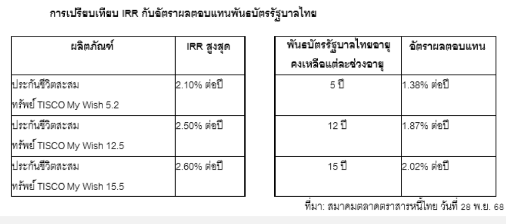 2. ประกันชีวิตสะสมทรัพย์ TISCO My Wish 15.5 รับประกันภัยโดย บริษัท อาคเนย์ประกันชีวิต จำกัด (มหาชน) (SELife) ให้อัตราผลตอบแทนเฉลี่ยต่อปี (IRR) สูงสุดถึง 2.60% ต่อปี*** พร้อมรับเงินคืนทุกปี ปีละ 5% ของจำนวนเงินเอาประกันภัยตลอดสัญญา เมื่อครบกำหนดสัญญารับเงินคืนสูงถึง 555% ของจำนวนเงินเอาประกันภัย เบี้ยประกันภัยสามารถลดหย่อนภาษีได้สูงสุด 100,000 บาท ตามหลักเกณฑ์ที่กรมสรรพากรกำหนด ชำระเบี้ยเป็นรายปี