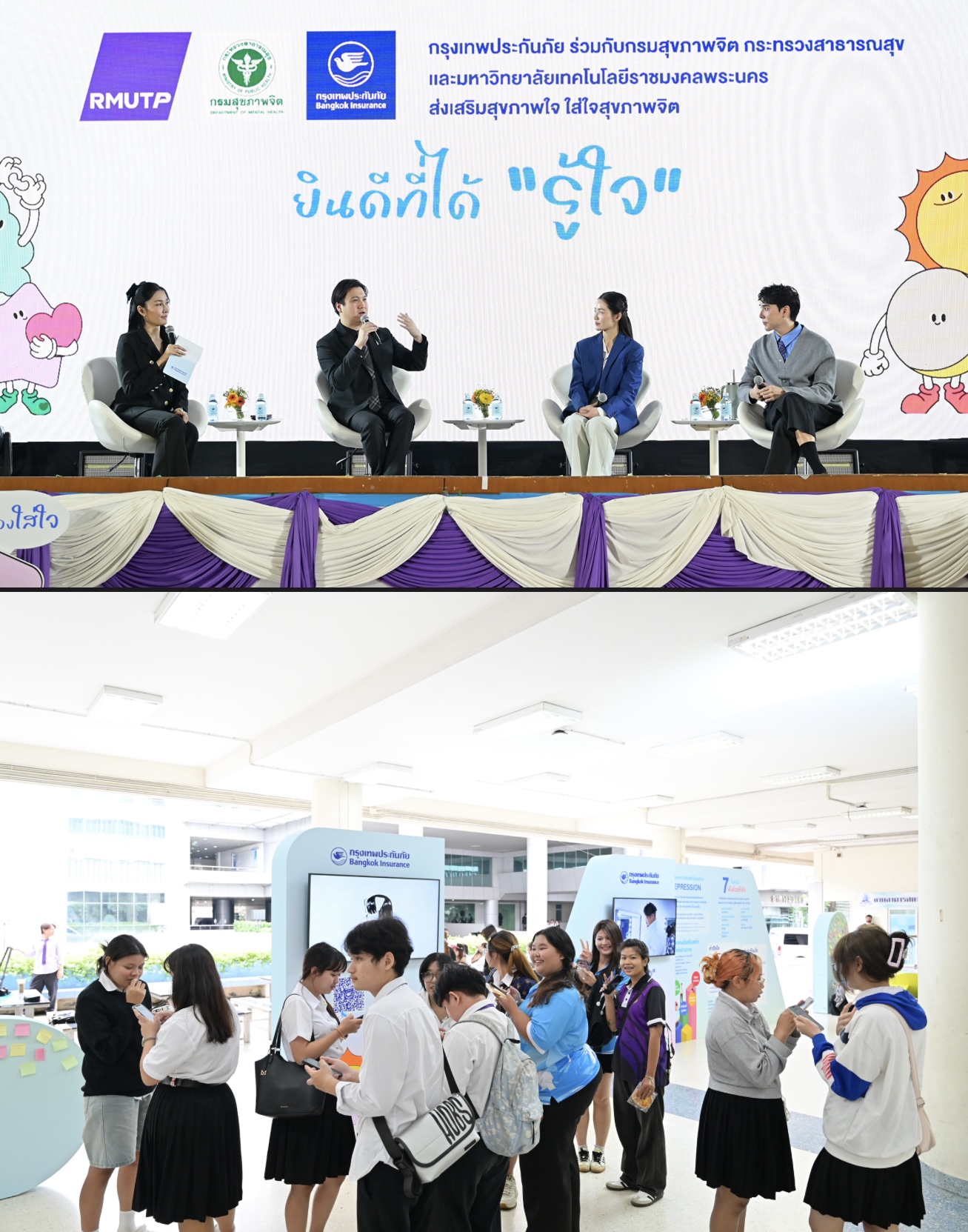 ด้วยความมุ่งมั่นที่จะส่งเสริมการดูแลสุขภาพจิตของคนไทย กรุงเทพประกันภัยร่วมกับกรมสุขภาพจิต กระทรวงสาธารณสุข เดินหน้าจัดกิจกรรม “กรุงเทพประกันภัย ส่งเสริมสุขภาพใจ ใส่ใจสุขภาพจิต”ต่อเนื่องเป็นปีที่ 2 ภายใต้แนวคิด “ยินดีที่ได้รู้ใจ” เพื่อรณรงค์ให้ความรู้ สร้างความตระหนัก และสร้างความเข้าใจเกี่ยวกับการดูแลสุขภาวะทางใจให้แก่เยาวชน คนรุ่นใหม่ และประชาชนทั่วไป ผ่านกิจกรรมการสื่อสารที่เข้าถึงง่าย หลากหลาย และเหมาะสม ด้วยการจัดนิทรรศการและการพูดคุยเสวนาในสถาบันการศึกษาต่างๆ ล่าสุดบริษัทฯ ได้รับความร่วมมืออย่างดีจากมหาวิทยาลัยเทคโนโลยีราชมงคลพระนคร ศูนย์พณิชยการพระนคร