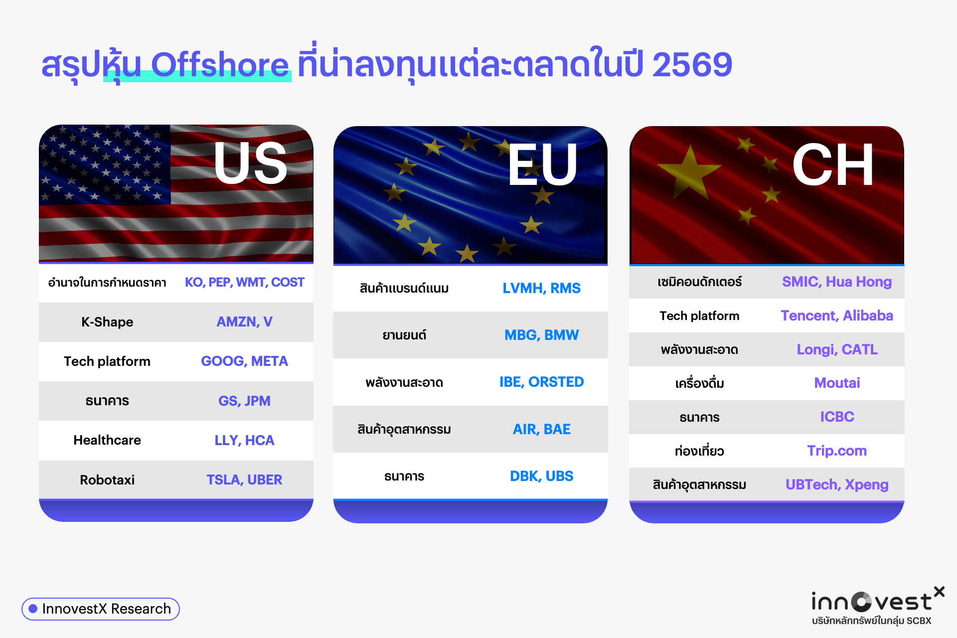 ขณะที่ นายสิทธิชัย ดวงรัตนฉายา หัวหน้านักกลยุทธ์ บริษัทหลักทรัพย์ อินโนเวสท์ เอกซ์ จำกัด กล่าวว่า “สำหรับตลาดหุ้นต่างประเทศ InnovestXแนะนำเน้นการลงทุนแบบ Selective โดยให้น้ำหนักกับหุ้นที่มีคุณภาพและกำไรเติบโตชัดเจน โดยตลาดสหรัฐฯ ยังเด่นในกลุ่มเทคโนโลยีแพลตฟอร์มและสุขภาพ เช่น Amazon, Google, Meta และ Eli Lilly ขณะที่ยุโรปน่าสนใจในกลุ่มแบรนด์พรีเมียมและพลังงานสะอาด เช่น LVMH และ Orsted ส่วนจีนเน้นหุ้นเทคโนโลยีและอุตสาหกรรมที่ได้รับแรงหนุนจากนโยบายรัฐ อาทิ Tencent และ CATL