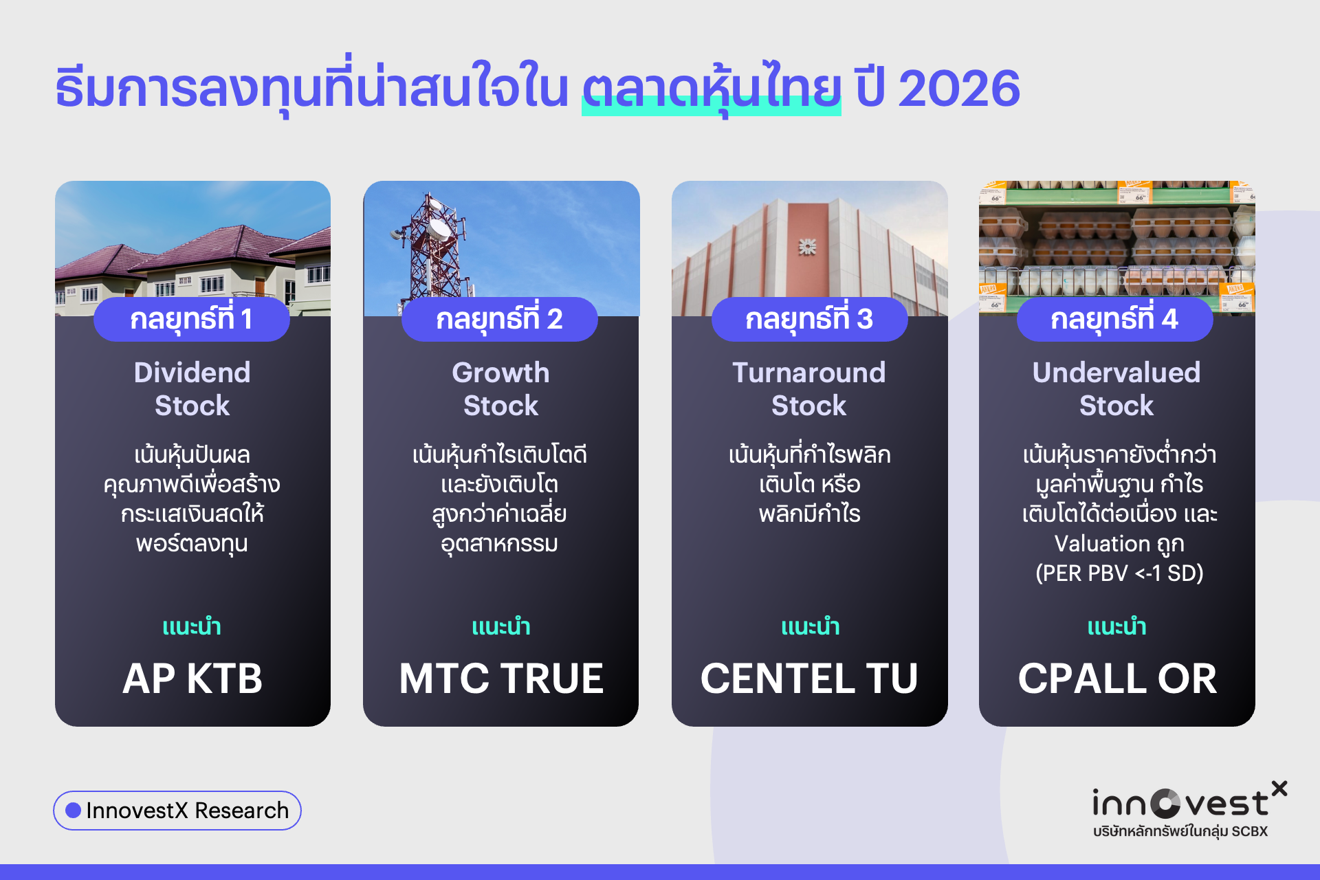 สำหรับตลาดหุ้นไทย แนะนำคัดเลือกหุ้นตามธีมการลงทุน โดยเน้นหุ้นปันผลคุณภาพเพื่อสร้างกระแสเงินสด เช่น AP และ KTB ขณะที่หุ้นเติบโตที่กำไรเริ่มฟื้นตัวเหมาะกับการลงทุนเชิงรุก เช่น MTC และ TRUE ส่วนหุ้นฟื้นตัวและหุ้นที่มูลค่าต่ำกว่าพื้นฐานยังน่าสนใจในกลุ่มท่องเที่ยว อาหาร และค้าปลีก เช่น CENTEL, TU, CPALL และ OR”
